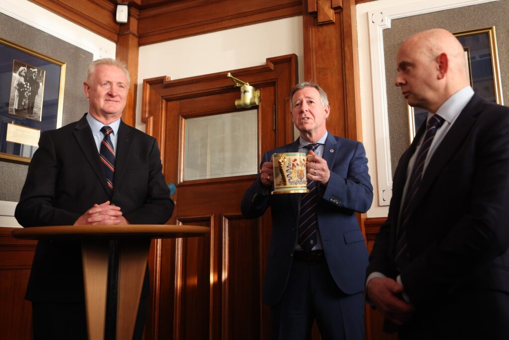 Rangers Chairman Fraser Thornton toast The King alongside Historian David Mason during the Loving Cup Ceremony in the Blue Room before the Scottish Premiership match at Ibrox Stadium, Glasgow.