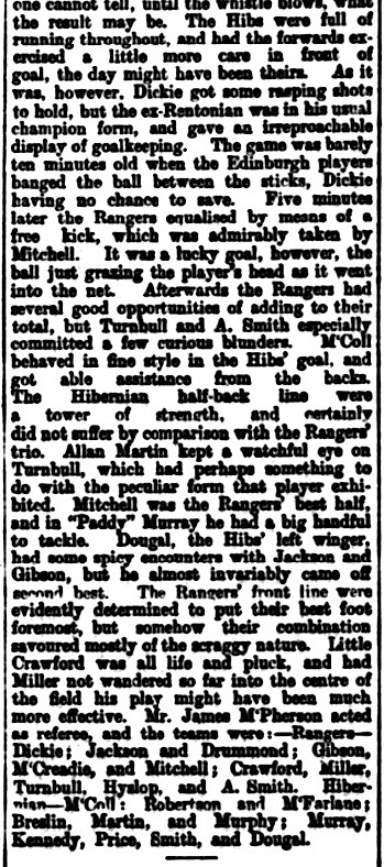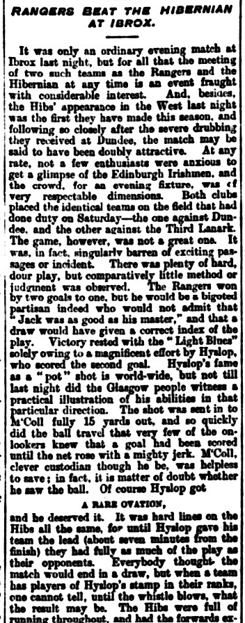It was only an ordinary evening match at Ibrox last night, but for all that the meeting of two such teams as the Rangers and the Hibernian at any time is an event fraught with considerable interest. And besides, the Hibs appearance in the West last night was the first they have made this season, and following so directly after the severe drubbing they received at Dundee, the match may be said to have been doubly attractive. At any rate, not a few enthusiasts were anxious to get a glimpse of the Edinburgh Irishmen, and the crowd for an evening fixture was of very respectable dimensions. Both clubs placed the identical teams on the field that had done duty on Saturday – the one against Dundee, and the other against Third Lanark. The game however, was not a great one. It was in fact singularly barren of exciting passages or incident. There was plenty of hard dour play, but comparatively little method or judgment was observed. The Rangers won by two goals to one, but he would be a bigoted partisan indeed who would not admit that ‘ Jack was as good as his master’, and that a draw would have given a correct index of the play. Victory rested with the ‘Light Blues’ solely owing to a magnificent effort by Hyslop who scored the second goal. Hyslop’s fame as a ‘pot’ shot is world-wide, but not till last night did the Glasgow people witness a practical illustration of his abilities in that particular direction. The shot was sent in to McColl fully 15 yards out, and so quickly did the ball travel that very few of the onlookers knew that a goal had been scored until the net rose with a mighty jerk. McColl clever custodian though he be, was helpless to save; in fact it is matters of doubt whether he saw the ball. Of course Hyslop got a rare ovation, and he deserved it. It was hard lines on the Hibs all the same, for until Hyslop gave his team the lead (about seven minutes from the finish) they had fully as much of the play as their opponents. Everybody thought the match would end in a draw, but when a team has players of Hyslop’s stamp in their ranks, one cannot tell, until the whistle blows, what the result may be. The Hibs were full of running throughout, and had the forwards exercised a little more care in front of goal, the day might have been theirs. As it was however, Dickie got some rasping shots to field, but the ex-Rentonian was in his usual champion form, and gave an irreproachable display of goalkeeping. The game was barely ten minutes old when the Edinburgh players banged the ball between the sticks, Dickie having no chance to save. Five minutes later the Rangers equalised by means of a free ‘kick’, which was admirably taken by Mitchell. It was a lucky goal, the ball just grazing the player’s hand as it went into the net. Afterwards the Rangers had several goal opportunities of adding to their total, but Turnbull and A Smith especially committed a few curious blunders. McColl behaved in fine style in the Hibs goal and got able assistance from the backs. The Hibernian half-back line were a tower of strength, and certainly did not suffer by comparison with the Rangers trio. Allan Martin kept a watchful eye on Turnbull, which had something to do with the peculiar form that player exhibited. Mitchell was the Rangers best half, and in ‘Paddy’ Murray he had a big handful to tackle. Dougal the Hibs left winger had some spicy encounters with Jackson and Gibson, but he almost invariably came off second best. The Rangers front line were evidently determined to put their best foot foremost, but somehow their combination savoured mostly of the scraggy nature. Little Crawford was all life and pluck, and had Miller not wandered so far into centre of the field his play might have been more effective. Mr James McPherson acted as referee.