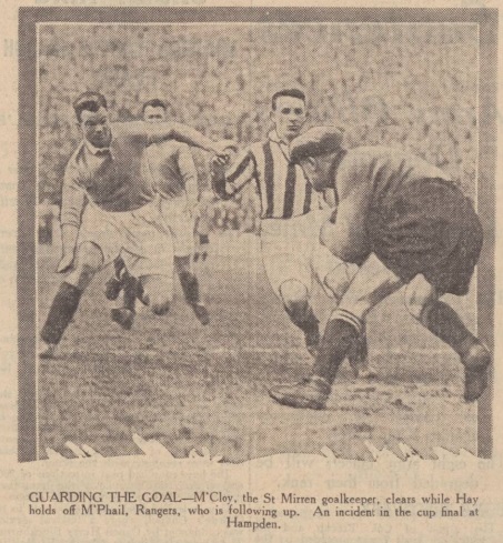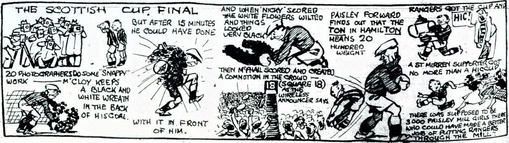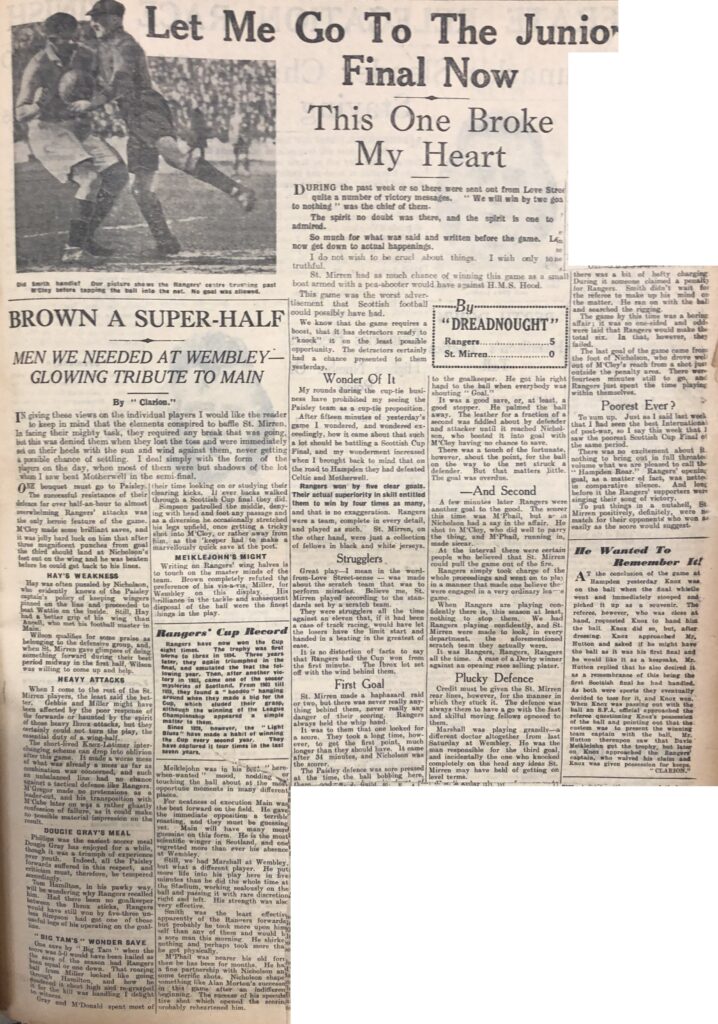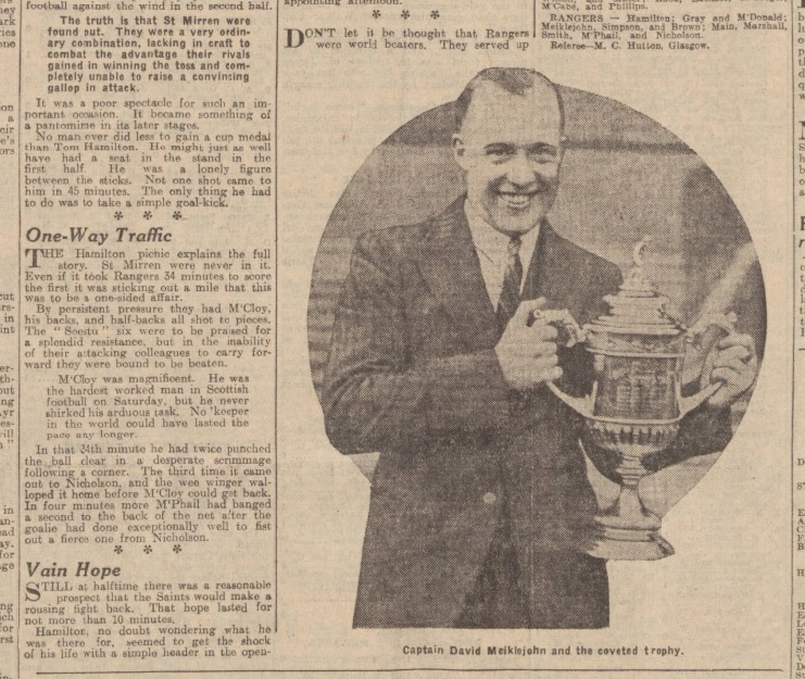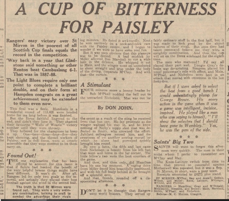 Rangers, by their smashing victory at Hampden, established themselves as one of the most brilliant combined in Scottish football since pre-war days. In every movement, in skill, in determination, in opportunism, they clearly outpointed St Mirren. Their five goals victory eloquently indicates the measure of their superiority. St Mirren failed to recapture even one minute of the flashing play that carried them through against Motherwell in the semi-final at Tynecastle. They themselves and their representatives who spoke at the presentation of the Cup after the game acknowledged the Light Blue might which staggered and shattered them. Gone were all hoped of a St Mirren victory, gone even the chance of a draw, when Davie Meiklejohn guessed correctly the fall of the coin. With that fast wind in their favour, and with a blinding sun to bemuse St Mirren, Rangers had an advantage that was worth a bundle of goals. The luck that no one could anticipate fell to Rangers. It is idle to speculate what might have happened had St Mirren won the toss. I simply must face the game as I saw it. For more than half-an-hour St Mirrens gallant defenders held Rangers at bay. There was. However, one weak link in the Saints defensive chain. Miller very seldom reproduced the live-wire tactics that earned him his Wembley cap. Slow in tackling and often out of position, he must have conveyed to the general of Light Blues side Meiklejohn the impression that he was off colour. Despite Ancells early successful attention to Main, I anticipated that most danger would develop on that right wing. Yet after the half-hour the danger actually developed on the left, where Hay and Gebbie had courageously held McPhail and Nicholson in check. Danger remained there till the interval. After that it switched over to the right, where Main took charge. Then it flitted about, prodding now Marshall, now Smith, now McPhail, and never once alighting on a Paisley player unless we consider that Miller received a touch when he hit the strongest shot of the match towards Tom Hamilton. At half-time my colleague Brigadier remarked to me, Rangers will play better against the wind. You will see more control. And it was so. The Light Blues played the football that charms. With more convincing opposition we would probably have had a memorable second half. As it was, the impoverished play of the Saints forwards robbed the match of any quality it may have possessed in the opening half-hour, and justified Chairman Flemings remark at the Cup presentation: Mr Fred Linder, of Aston Villa, came North to see his first Scottish Cup final. I wonder Why! Nicholsons opening goal resulted from a fierce ball that might have found the net direct, but that was deflected by Ancells shoulder. The second was secured by the ever-ready McPhail, after Nicholson had shot in. McPhails deft kick into the net is the kind of thing that stamps a man as a master. All hoped of St Mirren rejuvenation after the interval were dispelled when Miller blundered badly and let Main away to score brilliantly. This player in every move in the second half must have set Director Alan Morton jumping with joy, metaphorically. Here, on the right wing, we saw Alan himself again. The fourth goal might not have been scored but for silly hesitation on the part of at least one St Mirren defender. When Marshall, boring through, was grassed in the penalty area, a Saint sinned by turning to indicate to the referee that there had been no foul in the incident. Just then Jimmy Smith stepped in and very easily sped the ball well out of McCloys reach. Nicholson capped an excellent days work when he smartly added the fifth after an inviting cross from Main. In a team which contained many stars, George Brown of Rangers stood out. On many occasions I have criticised Brown for his failure to assist his full-back thoroughly. This time he was the complete half-back, not merely checking an opponent, but also most times securing the ball in a tackle and then advancing with a definite purpose. Brown certainly earned the bouquet. His display, and that of others on the side, is a material argument in favour of fixing the big internation game for a date after the Scottish and English finals. Tom Hamilton accomplished all that was required and that was mighty little in Rangers goal. Gray and McDonald were not merely defending full-backs. They placed the ball brainily, particularly in the second half, when a hard-hit ball would have been blown back. Meiklejohn played the veteran part skilfully. His value is inestimable. Simpson seldom figured obtrusively. His was simply the watchmans part. Right well he acted! Brown, I have mentioned. Were not the bouquet to go to Brown, Main would get it. Gere again we must regret that the international came before the Cup final. If the Scottish team were to be selected this afternoon, almost evert man of Rangers would be favourite for a place and Main would be one of the first to be selected. Marshall appeared in an entirely different light from that of Wembley. His understanding with Main provided a noteworthy feature. His pass for that third goal was as neat as Mains culminating shot. Smith found a ready opponent in Wilson. The centre-half compelled the centre to wheel right or left, but usually Smith succeeded in applying an adroit touch that gave Marshall or McPhail, or either winger, a chance to make progress. Smith was a big success. McPhail recovered all his form. In harassing, in passing, in shooting, he showed that his rest has restored his energy. Nicholson, I have seldom seen do better. He had a powerful adversary in Hay, but in the end, he was master of that doughty defender. McCloy, I do not blame in any way. This lad had the hardest days work of his career. On several occasions he saved brilliantly. Hay and Ancell clearly transcended the other sections if the Saints team. Wilson, I consider the best of the halfs. Ubiquitous and daring, he intervened as often on the wings 