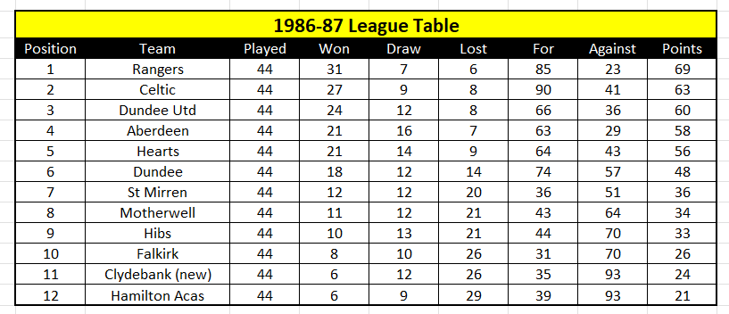 But despite lifting the first trophy available, as 1986 drew to a close, Souness’s side still hadn’t found top gear. They were still toiling in the league and their UEFA Cup adventure had ended in West Germany. A 1-1 draw against Borussia Monchengladbach at Ibrox was followed by a 0-0 stalemate that saw Munro and Cooper dismissed, the West Germans therefore progressing on the away goals rule. But the goal scored by Uwe Rahn at Ibrox proved to be significant for the Rangers defence would not be breached again until 31 January, a run of 1,196 minutes that would see Chris Woods chalk up 12 consecutive clean sheets. And during that run, Rangers hit the Premier Division summit.