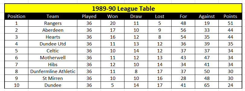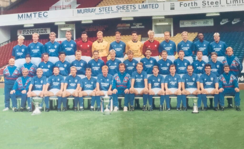 Review by Alistair Aird 10 July 1989. The day that the footballing Richter scale was off the charts. Events didn’t just cause a rumble in the Parkhead jungle, they shook the very bedrock of Scottish Football. Rangers had long been pilloried for a perceived aversion to signing Roman Catholic players. But Graeme Souness had been intent on bucking that trend. He had tried to no avail to sign Ray Houghton and John Collins, but a chance meeting with the football agent Bill McMurdo set in motion a chain of events that would culminate with furor on both sides of the Old Firm divide. It seemed set in stone. Maurice Johnston was leaving Nantes to sign up for a second spell with his beloved Celtic. He was even paraded at Parkhead in a green-and-white hooped jersey. But all was not as it seemed. No ink had found its way onto a contract, the deal had not been sealed. And when he got wind of this, Souness swooped to snare a world-class centre forward to help score the goals that would keep his Rangers side at the forefront of the Scottish game. After making public appearances in friendly matches against Airdrie, Kilmarnock and Partick Thistle, Johnston donned a blue jersey at Ibrox for the first time when Rangers defeated Tottenham Hotspur 1-0. Trevor Steven, the other major signing of the summer, netted the only goal. But Johnston and Rangers’ league campaign would get off to an inauspicious start. The opening two league games were lost – 1-0 against St Mirren and 2-0 against Hibernian – and Johnston would miss several chances to score in game number three, a 1-1 draw against his old club, Celtic, at Parkhead. Souness was scathing after that one, apportioning blame to McCoist and Johnston. ‘Some bad finishing by Scotland’s strike force cost us the game,’ was the opinion of the Rangers manager. He had a point too. In those eight league games, Rangers scored just six times. McCoist had grabbed three, Johnston two and captain Butcher the other. This was not in the script. But the defeat in Lanarkshire would be a turning point. It was followed by five straight wins, and when Johnston scored a last-gasp winner against Celtic at Ibrox on 4 November, Rangers were top of the table. There would be a wobble at Pittodrie 18 days later, but that was followed by an 15-match unbeaten run that saw 24 out of a possible 30 points gained. That sequence witnessed a 1-0 win at Parkhead – the recently acquired Nigel Spackman got the goal – and a 3-0 victory over Dunfermline Athletic at Ibrox. The tail end of the unbeaten run had featured four successive draws. Ahead of the first of them – a 1-1 draw at Fir Park – Rangers led second-placed Hearts by seven points. But when the run was ended by a 1-0 home defeat against Hibernian, the gap had been reduced to five points – Aberdeen were now the closest challengers – with six games to go. The popular opinion was that Rangers were rocking. But on 1 April, they allayed any fears their fans may have had that they would fall at the final furlong. Celtic came to Ibrox for the fourth and final Old Firm league match of the season. They did so in fourth place on the league ladder, nine points adrift of Rangers having won only 10 of their 30 league matches. And on April Fool’s Day, they were made to look foolish by a rampant Rangers side that won convincingly by three goals to nil. Mark Walters opened the scoring from the penalty spot after Anton Rogan had inexplicably handled in the box. Johnston made it 2-0 with a volley after being teed up by McCoist, and unlike his goal back in November, this one came in front of the Celtic fans congregated in the Broomloan Stand. And McCoist completed the rout with the third goal, emphatically ramming his penalty kick into the top corner. The title was secured at Tannadice just shy of three weeks later. Stuart Munro fired in a cross with his right foot and Trevor Steven thumped a header into the net. The clean sheet was the nineteenth of the league campaign, and number 20 arrived a week later in a 2-0 win over Dunfermline Athletic. Much of the focus had been on the goals scored by Johnston and McCoist, but the stoicism of the defensive unit was also a major contributory factor in the retention of the championship. Only 19 goals were conceded in the 36 league games, with Dundee (twice) and Hibernian the only teams that managed to score more than once against Rangers in a league fixture. Stuart Munro, the epitome of an unsung hero, played in each of the 45 first-team matches that season. After several attempts to replace him at left back – Jimmy Phillips and Jan Bartram being two examples of players Souness had signed to play in that position – Munro showed the manager that had no need to look elsewhere for he already had a solid, dependable and very capable full back at his disposal. After losing out in two successive epic League Cup Finals, Aberdeen won Part 3 of the trilogy. Paul Mason and Mark Walters scored in the regulation 90 minutes to force extra time, although Rangers were unfortunate to see efforts from Johnston and Steven cannon off the woodwork. But the spoils of victory would go to the men clad in red when Mason scored his second goal of the game seven minutes from the end of extra time. The Dons won the Scottish Cup too, beating Celtic 9-8 on penalties. Celtic had eliminated Rangers in Round Four – writing in the Evening Times, Alan Davidson said of the 1-0 loss: ‘Rangers can dismiss the defeat as little other than a hiccup on their way towards membership of Europe’s elite’ – but defeat at Hampden coupled with a semi-final loss to Aberdeen in the League Cup and a fifth placed finish in the league – Celtic finished 17 points adrift of Rangers – meant the first of what would be five trophyless seasons for the men in green and white. In that timeframe, still punch drunk from losing out on Johnston, Celtic would contest only one major Cup Final – they lost 2-1 to Rangers in the 1990/91 Lea