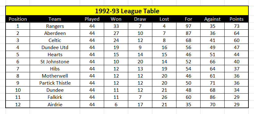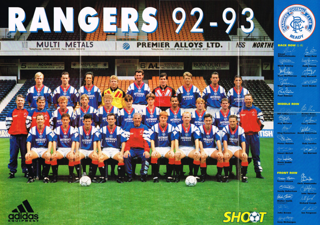 Written by Alistair Aird Going into season 1992/93, Rangers were on a roll. After going nine years without a league title, they had won five of the last six. The League Cup had almost been a permanent fixture on the Ibrox sideboard, and an 11-year Scottish Cup hoodoo had been busted too. The Double-winning squad was bolstered with three additions. Ally Maxwell, a Scottish Cup winner with Motherwell, came in to provide back up for Andy Goram, Dave McPherson, who had become a Scottish international after leaving Rangers for Hearts in the summer of 1987, came back to Ibrox for a second spell, as did Trevor Steven, who returned from the south of France after less than a year away. Departing for pastures new were strikers John Spencer and Paul Rideout. Both had found it impossible to supplant McCoist and Hateley so moved on. Both would flourish too, with Spencer thriving at Chelsea and Rideout going on to score the winning goal for Everton in the 1995 FA Cup Final. For the second successive season, St Johnstone were at Ibrox when the curtain for the new campaign was raised. But on this occasion, there would be no romp like there had been 12 months earlier. Instead, it took a solitary McCoist goal to earn a 1-0 win. Goals from Gordon and Hateley earned a 2-0 win over Airdrie, a result that preceded a brief hiccup. There was a goalless draw at Easter Road before a Simon Stainrod-inspired Dundee created an unexpected bump in the road. Rangers lost 4-3 at Dens Park, but that would be the last time a Rangers side would endure the bitter taste of defeat until March, a run of 44 matches unbeaten in all competitions. Ian Durrant scored to earn a share of the spoils in the season’s first Old Firm league match and that was followed by 11 successive league wins. McCoist scored 18 times in that run which included two hat tricks against Motherwell and four goals against Falkirk. Riding the crest of a wave, McCoist wore the captain’s armband too, deputising for the injured Richard Gough against Dundee United at Tannadice and in that 4-0 win over Falkirk at Ibrox. A win over Partick Thistle was sandwiched between draws at Tynecastle and Broomfield, the latter being followed by eight straight wins. Included in that run was a 1-0 win over Celtic on 2 January. Trevor Steven scored the goal with a fine header. The unbeaten run would eventually come to a halt at Parkhead on 20 March. Celtic won 2-1 in a match that would prove to be the last time Scott Nisbet played for the Rangers first XI. Aged just 25, his career would be ended by a pelvic injury. Across all four competitions, Rangers were unbeaten in 44 games. That comprised four League Cup ties, three matches in the Scottish Cup, eight in the European Cup/Champions League, and 29 in the league. Of those 44 matches, only eight were drawn. A fifth successive title was sealed with four games to spare courtesy of a 1-0 win over Airdrie at Broomfield on 1 May. And even though Rangers lost two of those final four games, they still finished nine points better off than runners-up Aberdeen. Sixteen goals were scored as Dumbarton, Stranraer, Dundee United and St Johnstone were swatted aside en-route to the League Cup Final. Rangers had thus contested 10 of the last 12 finals in the competition. In the other two campaigns – 1985/86 and 1991/92 – they had lost in the semi-finals, ironically against Hibernian on both occasions. Aberdeen provided the opposition at Hampden and Rangers would profit from a recently introduced ruling. Goalkeepers were no longer allowed to handle a backpass from one of their own players so when the ball spun towards Theo Snelders from an Aberdeen boot, the Dutch keeper elected to try and control the ball with his chest. But it bounced back into play and Stuart McCall devoured the rebound. Duncan Shearer struck in the second half to force extra time, but Rangers would edge it in the extra half hour. Robertson’s searching cross was aimed towards Hateley, but Gary Smith got on the end of it and sent a diving header beyond his own goalkeeper. The Dons would be runners up in the Scottish Cup Final too. Rangers didn’t have a home draw in the competition, as they defeated Motherwell at Fir Park (2-0), Ayr United at Somerset Park (2-0), and Arbroath at Gayfield (3-0). The semi-final against Hearts was played at Parkhead. McPherson and McCoist scored the goals in a 2-1 win. McCoist’s goal – a lob over the outrushing Nicky Walker – was his 49th of the season. He would be denied the opportunity to hit the half century, though. On 28 April, McCoist was in the Scotland side that were drubbed 5-0 by Portugal in Lisbon. He sustained a broken leg that ruled him out for the rest of the season thus robbing him of the opportunity to become the first Rangers player since Jim Forrest in season 1964/65 to score more than 50 goals in one campaign. The leg break ruled McCoist out of the Scottish Cup Final. Played once again at Parkhead, Neil Murray opened the scoring before Hateley scored his 29th goal of the season to not only clinch the Cup but also the domestic Treble for the first time since season 1977/78. Home and away wins over Danish champions Lyngby set up a mouthwatering ‘Battle of Britain’ against Leeds United. Opposition supporters were excluded from attending the home matches and a partisan Ibrox was silenced within a minute of the first leg when Gary McAllister rifled a volley into the roof of the net. But voices weren’t stilled for long. The Leeds goalkeeper, John Luckic, flapped at a Durrant corner and punched the ball into his own net before McCoist, prowling like a predator in the six-yard box, rammed in the rebound after Luckic had parried a header from McPherson. Rangers thus had a slender lead to take to Elland Road a fortnight later. The English media felt that wouldn’t be enough, arrogantly predicting that Leeds would progress comfortably to the group stages of what was the inaugural Champions League. But that only ser