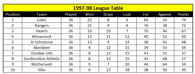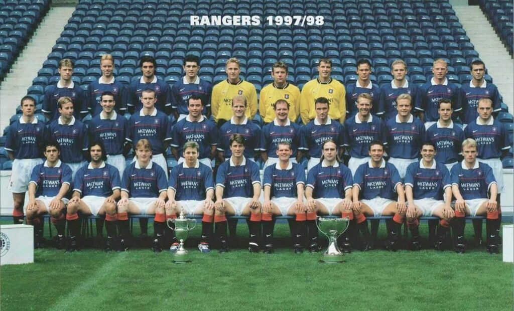 Words by Alistair Aird Having managed to match Celtic’s achievement of nine successive league titles the previous season, the sights of the Rangers squad were firmly fixed on securing an unprecedented 10-in-a-row as the new campaign dawned. And they would do so under the guidance of a new on-the-field leader. After almost 10 years at Ibrox, Richard Gough left in the summer of 1997 and headed to America to sign for Kansas City Wizards. Since taking over the armband from Terry Butcher, Gough had captained Rangers to seven league titles, four League Cups and three Scottish Cups. And over the course of nine-in-a-row, no one wore a blue jersey in a league game more often than Gough who had played in 263 of the 348 fixtures. Replacing Gough as skipper was Brian Laudrup. Rumours were rife that the Great Dane, Scotland’s Player of the Year, was set to leave Rangers, but he was convinced to stay and he was handed the responsibility of marshalling the troops and getting them ready for an assault on another league title. The squad was bolstered once again with an abundance of cash splashed to secure the services of four Italians – Lorenzo Amoruso, Marco Negri, Rino Gattuso and Sergio Porrini – and they were joined by Staale Stensaas, a Norwegian left back, and the Finnish goalkeeper, Antti Niemi. The Swedish midfielder, Jonas Thern, also came on board. Pre-season witnessed defeats at Goodison Park and Tynecastle and a thumping 5-0 win over Stirling Albion. The ‘Whites’ then thrashed the ‘Blues’ 6-1 when Rangers faced Rangers at Ibrox on a family day. Ally McCoist took great delight in scoring a hat trick for what was supposed to be the second XI. McCoist would, however, spend much of the first half of the season looking on from the sidelines as a moody Negri embarked on a red-hot goal streak. Negri followed up a brace in the opening league fixture against Hearts with all five goals in a 5-1 win over Dundee United. Indeed, he would find the net in each of the opening 10 league matches, his rich vein of form helping Rangers to seven wins and two draws in those fixtures. By 27 December, Negri’s league tally stood at 30 in just 19 games. But in the 17 that followed, he scored only three times. An eye injury sustained while playing squash was cited as a contributory factor for the loss of form. It could be argued that the injury also cost Rangers the title. With Amoruso ruled out of action for several months, Gough answered Walter Smith’s SOS. He crossed the wild Atlantic to come back to Scotland, his first match back witnessing four goals from Negri, a couple from Gascoigne and one from Laudrup as Dunfermline were thrashed 7-0 at Ibrox. Gough also netted the only goal in a 1-0 home win over Celtic. Over the course of the season, Gough would miss only five league games, but his return would not be a triumphant one. For the first time since he had been made captain, Gough would not end the season with his hands cupped around the league trophy. Rangers won 12 and drew six of their first 19 league games. The only defeat came at Tannadice in October. One of those draws was costly, though. At Parkhead in November 10-man Rangers – Gascoigne had been ordered off by referee John Rowbotham – led 1-0 going into stoppage time. After by his lofty standards a ‘barren spell’ of two league games without a goal, Negri’s rapier-like finish looked to have given Rangers a decisive edge. But an Alan Stubbs header rescued what would prove to be a precious point for Celtic. On their return to the east end of Glasgow on 2 January, Rangers lost 2-0, their first Old Firm league defeat since May 1995 and only their second reverse in the league that season. The momentum was starting to swing. Rangers won just three of their next eight games and then lost Gascoigne who was sold to Middlesbrough in March. Many felt that his departure gave Celtic the belief that they could pip Rangers at the post and win the league. McCoist was called upon to steady the ship. Before he scored in a 2-1 defeat at Fir Park in March, the veteran had started only one league game, ironically against Motherwell in late November. But he would feature in the final nine league matches, scoring four times. Alas, Amoruso, who had finally made his long-awaited debut in March, was ordered off in a 1-0 defeat at Pittodrie. And a similar scoreline against Kilmarnock at Ibrox in the penultimate fixture all but secured the title for Celtic. They beat St Johnstone 2-0 at home on the last day to finish two points ahead of Rangers. The season would finish with no silverware for the first time since season 1985/86. Hamilton Accies and Falkirk were beaten in the opening two rounds of the League Cup, but a goal from ex-Ranger Gary McSwegan earned Dundee United a 1-0 win in the quarter finals. The Accies were beaten once again in the Scottish Cup and wins after replays saw off both Motherwell and Dundee. McCoist and Albertz then scored to see off Celtic’s challenge in the last four, but Hearts would edge a controversial final by two goals to one. Europe would prove to be a disappointment too. After easing to an 11-0 aggregate win over GI Gotu, IFK Gothenburg emphatically ended hopes of group stage football in the Champions League. And after parachuting into the UEFA Cup, Rangers lost home and away against RC Strasbourg. The season ultimately marked the end of one of the most successful eras in the club’s history. Walter Smith had announced that he intended to step down as manager – he would be replaced at the helm by the Dutchman, Dick Advocaat – and totemic figures like Durrant, McCoist, Laudrup, Gough and Goram departed too. The group had shared so much success and silverware, but all good things must come to an end.